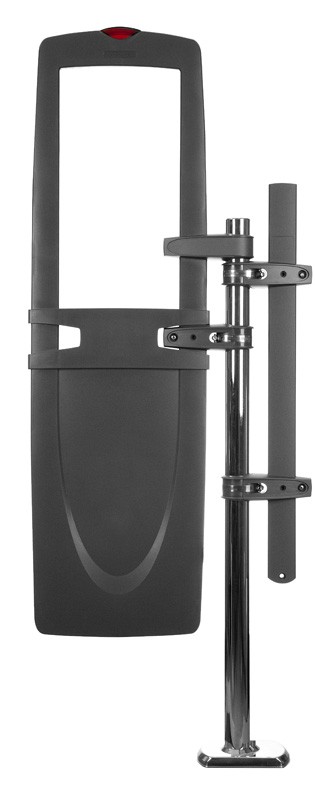 The Ultra Lane AMS-1080 detection system consists of an AMS-1080 controller, up to four AMS-1080 antennas, and up to two pairs of Ranger ferrite antennas. The detection system deters theft in up to four food store checkout aisles (each aisle independently supported) by activating an alarm when it detects the unique response of an active Ultra Max security label. To detect a label, AMS-1080 antenna(s) connected to the controller emit a magnetic field close to the label's natural frequency causing it to vibrate at the frequency of the field. When the field is removed, energy in the tag/label dissipates resulting in a tag signal. The AMS-1080 antenna(s)—and Ranger antennas, if used—pick up incoming signals and send them to the controller which determines if they are indicative of a tag signal. If it is, then the controller activates an audio/visual alarm at the top of the AMS-1080 antenna that detected the label. When the AMS-1080 antenna is positioned between two adjacent checkout aisles, each side of the visual alarm can be set to light only in the aisle where the label was detected. |